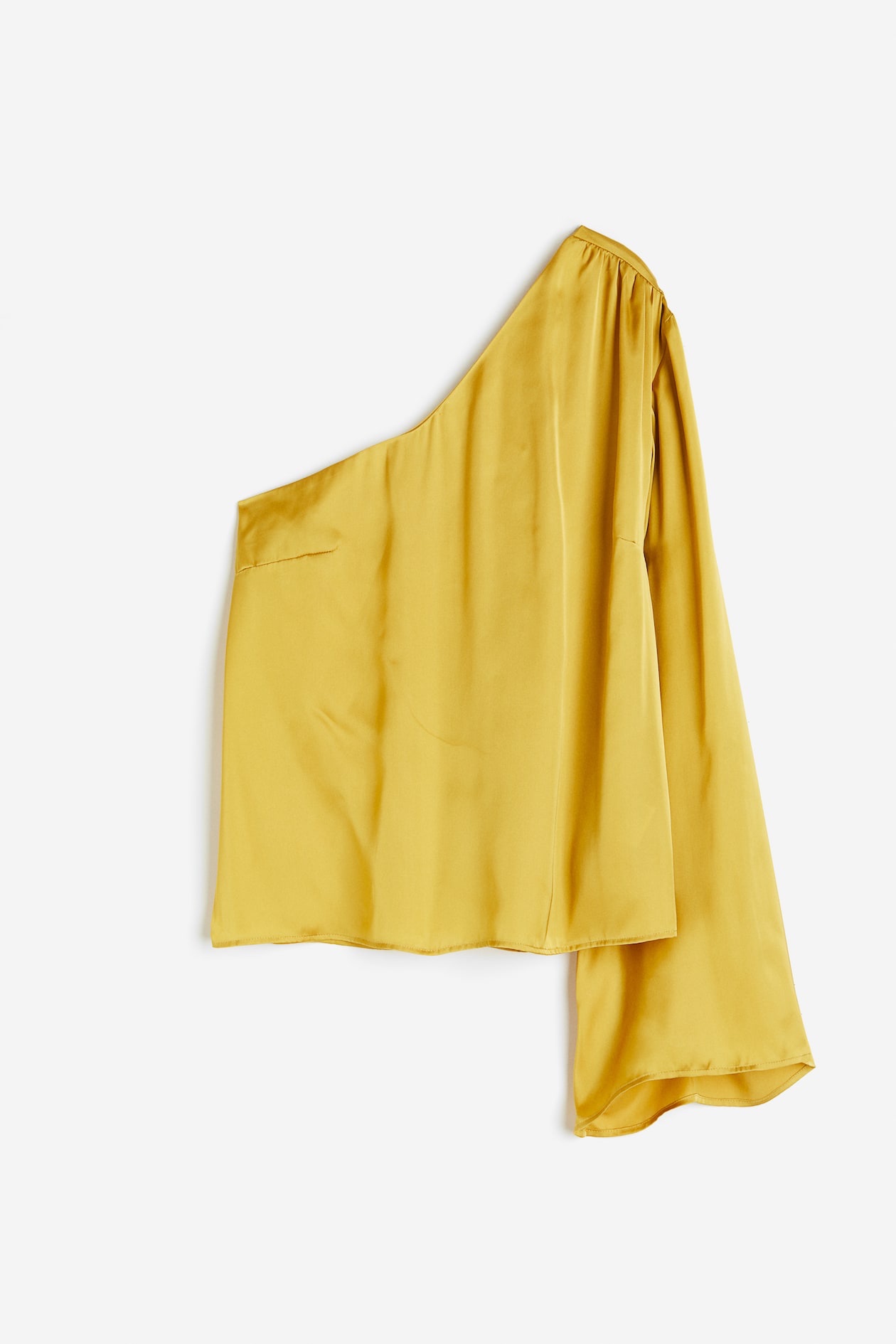 Blusa de un hombro con escote asimétrico. Modelo con pliegues en el hombro y una manga larga acampanada.