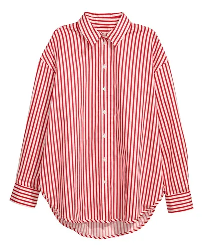 Camisa de corte holgado de algodón con cuello clásico, hombros caídos, botones adelante y en los puños, y bajo redondeado con aberturas laterales.