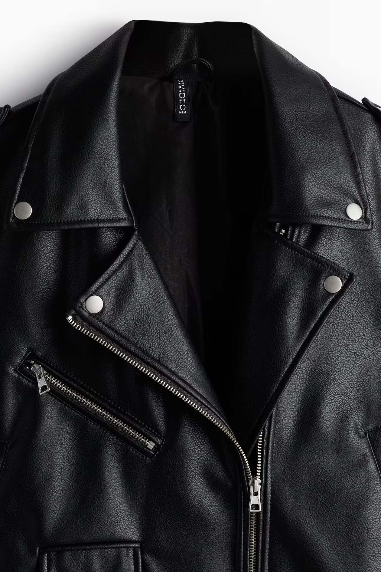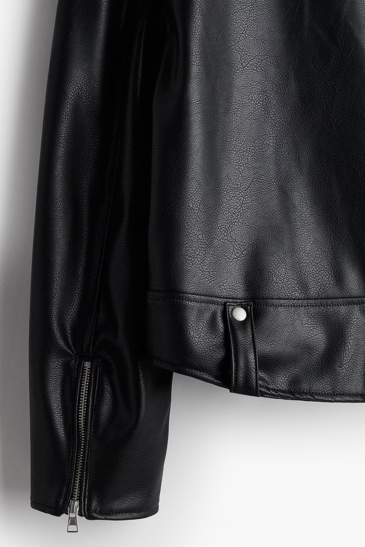 Campera H&M Eco-Cuero biker en tejido revestido con cierre diagonal y botones de presión decorativos. Abrojo en los hombros con botón de presión y cierre en los puños. Bolsillo superior con cierre, bolsillos insertados y bolsillo decorativo con solapa y botón de presión adelante. Forrada.