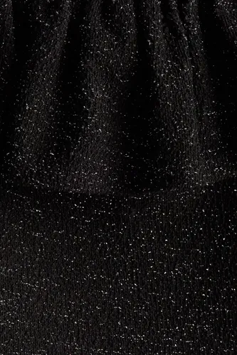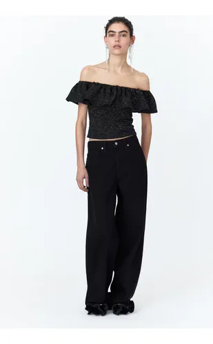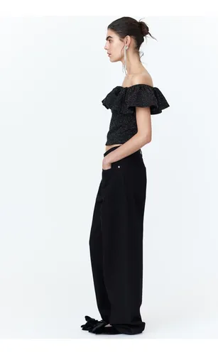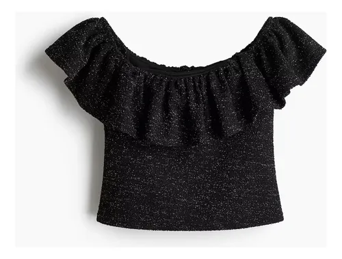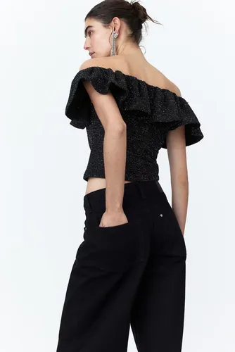 Top en punto texturizado con hilos brillantes. Modelo de ajuste entallado con hombros al descubierto y volante ancho en el escote.