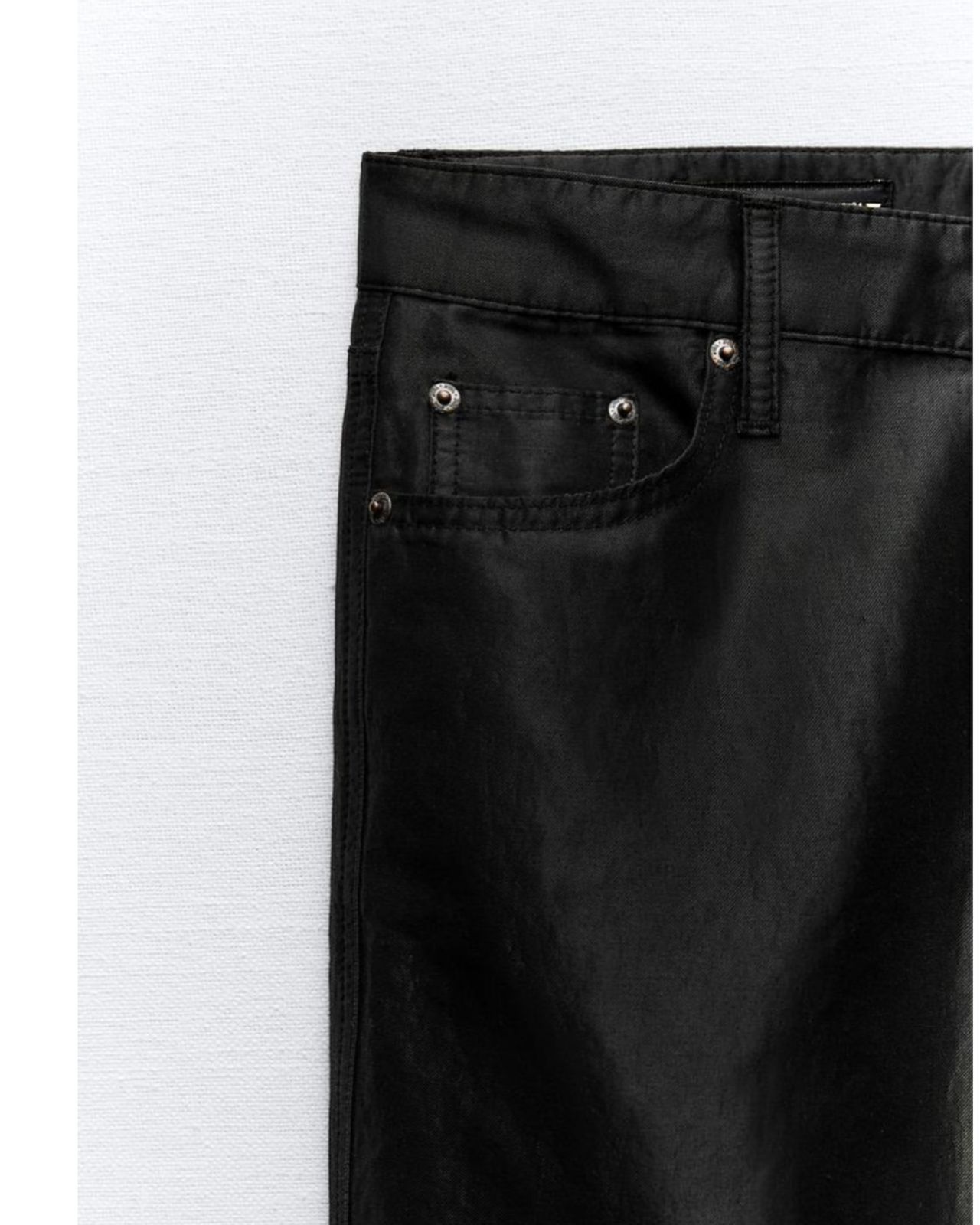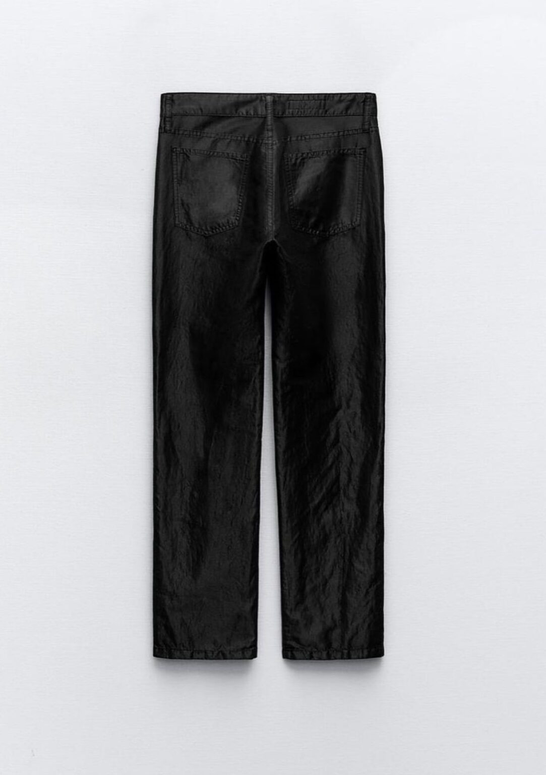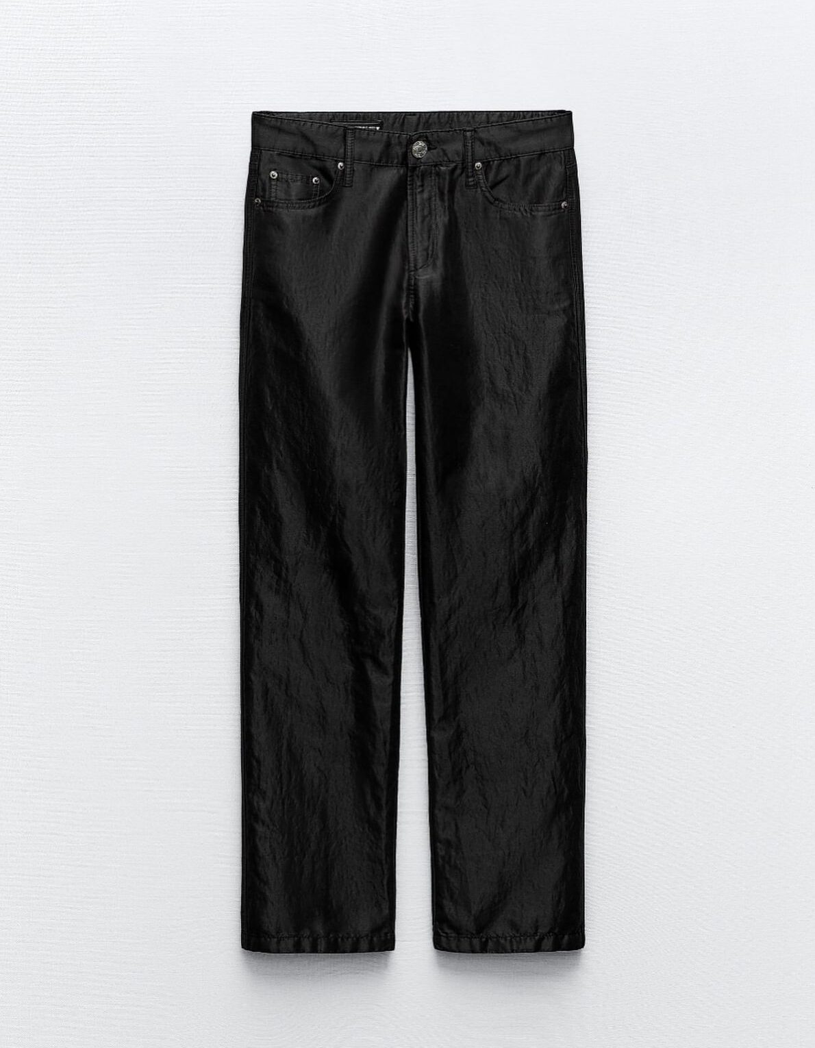 Pantalón tiro medio de algodón con efecto satinado. Cinco bolsillos. Cierre frontal y botón metálico.