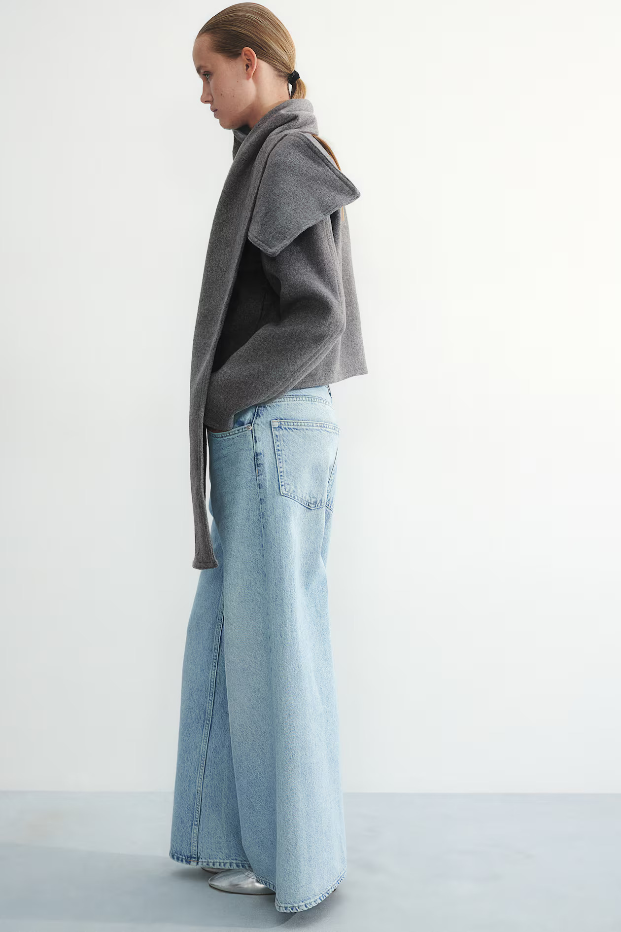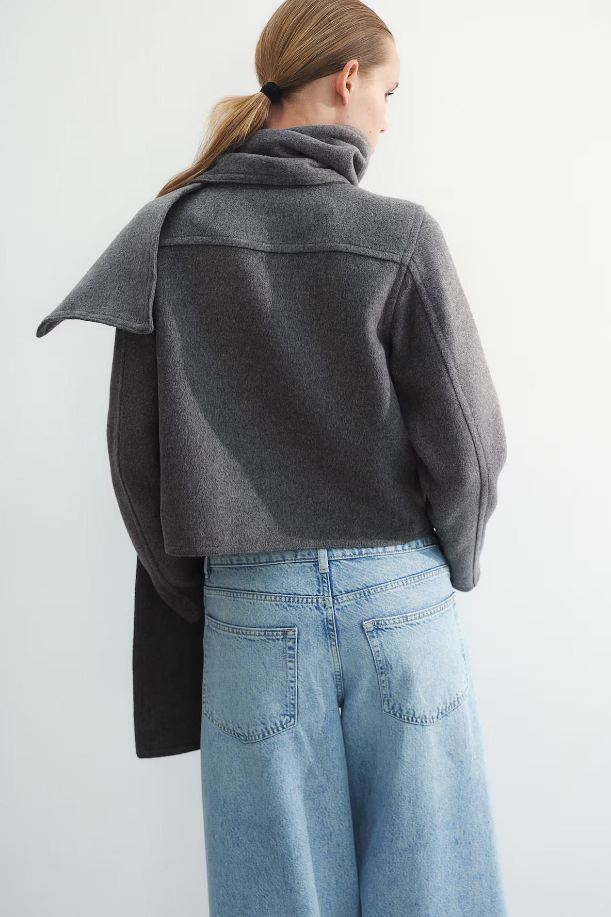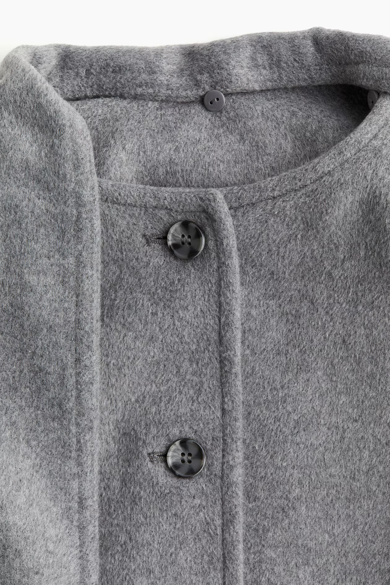 Tapado corto de paño suave con bufanda extraíble que se abotona en la nuca. Modelo con cuello redondo, botones frontales y bolsillos discretos en las costuras laterales. Sin forrar.