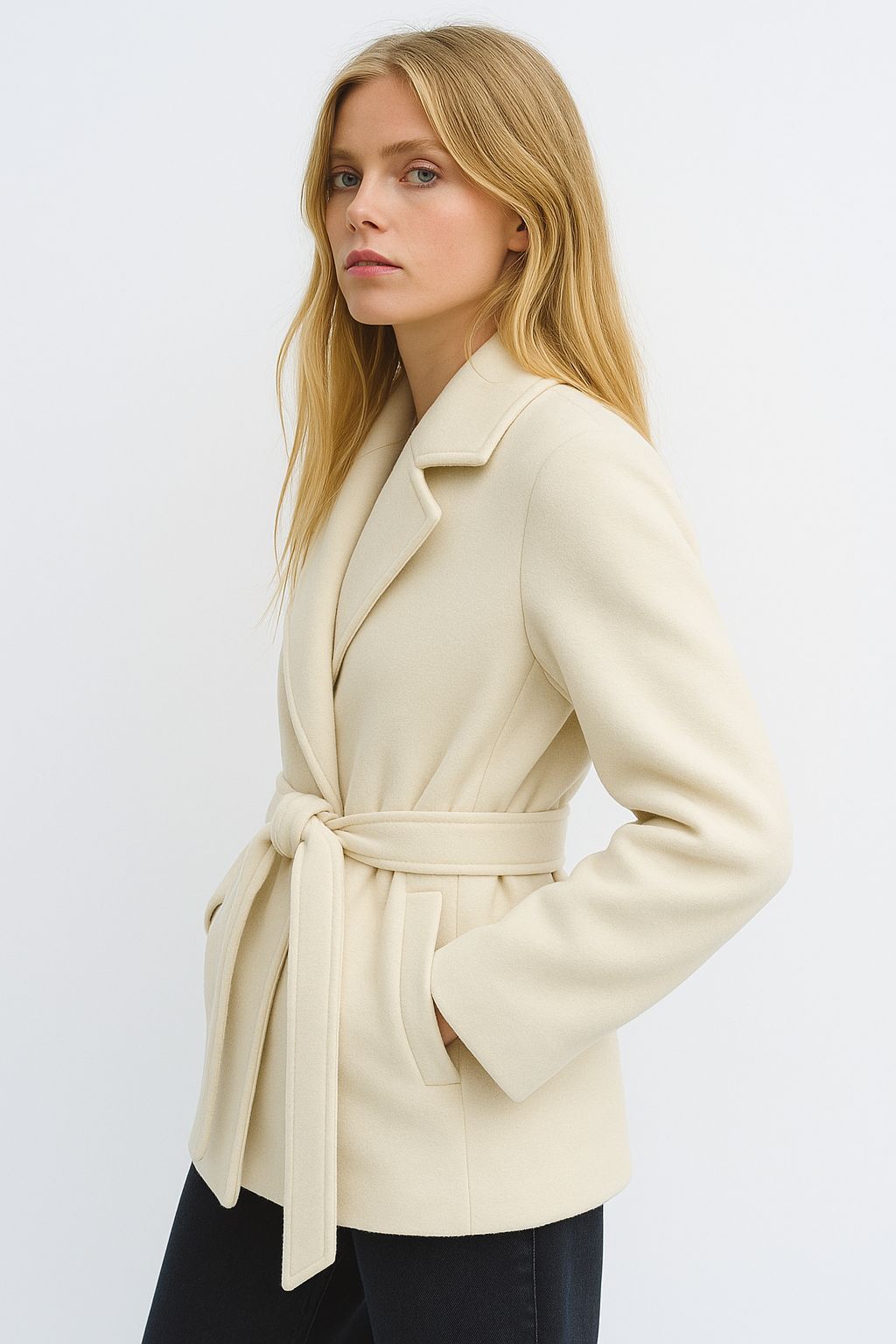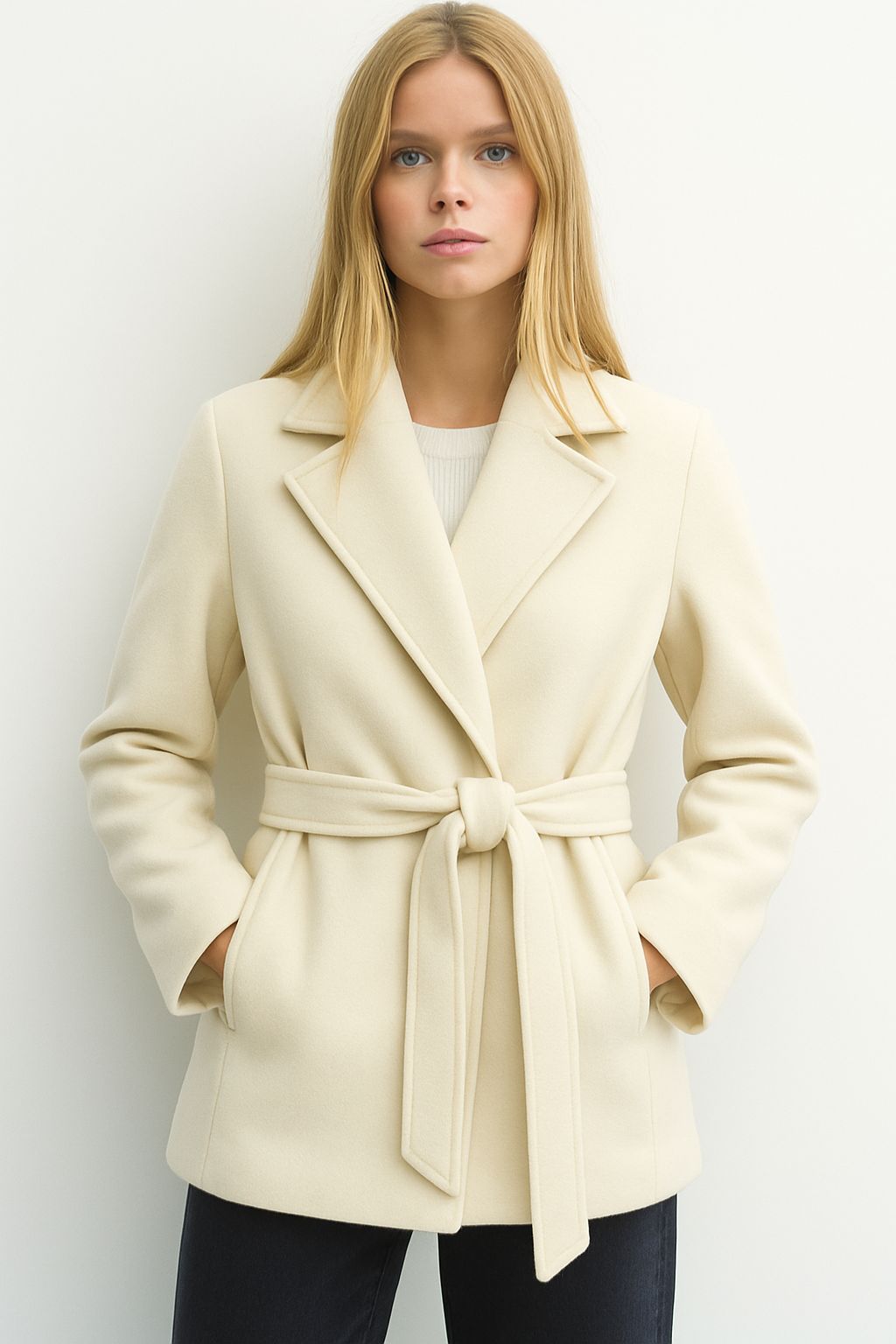 Abrigo corto de paño suave con cuello y solapas. Modelo de corte holgado con cinturón extraíble y bolsillos delanteros insertados. Forrado.