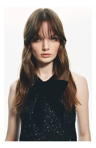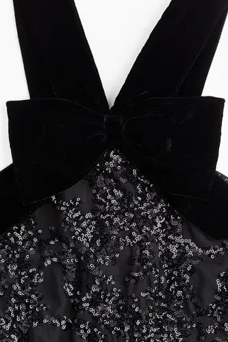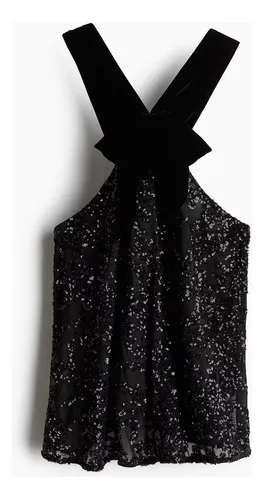 Top en malla revestida de lentejuelas. Modelo con escote alto, tirantes anchos y lazo decorativo de velour delante. Forrado.