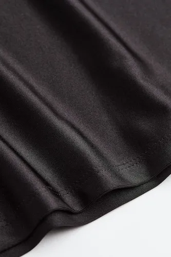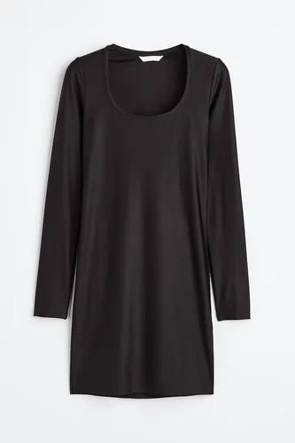 Vestido entallado corto en punto suave con ligero brillo. Modelo escotado con mangas largas.