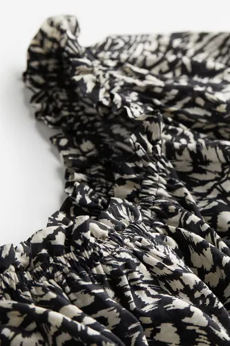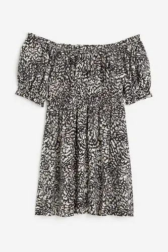 Vestido corto con hombros descubiertos. Modelo con sección nido de abeja, mangas cortas y elástico fino. Sin forrar.