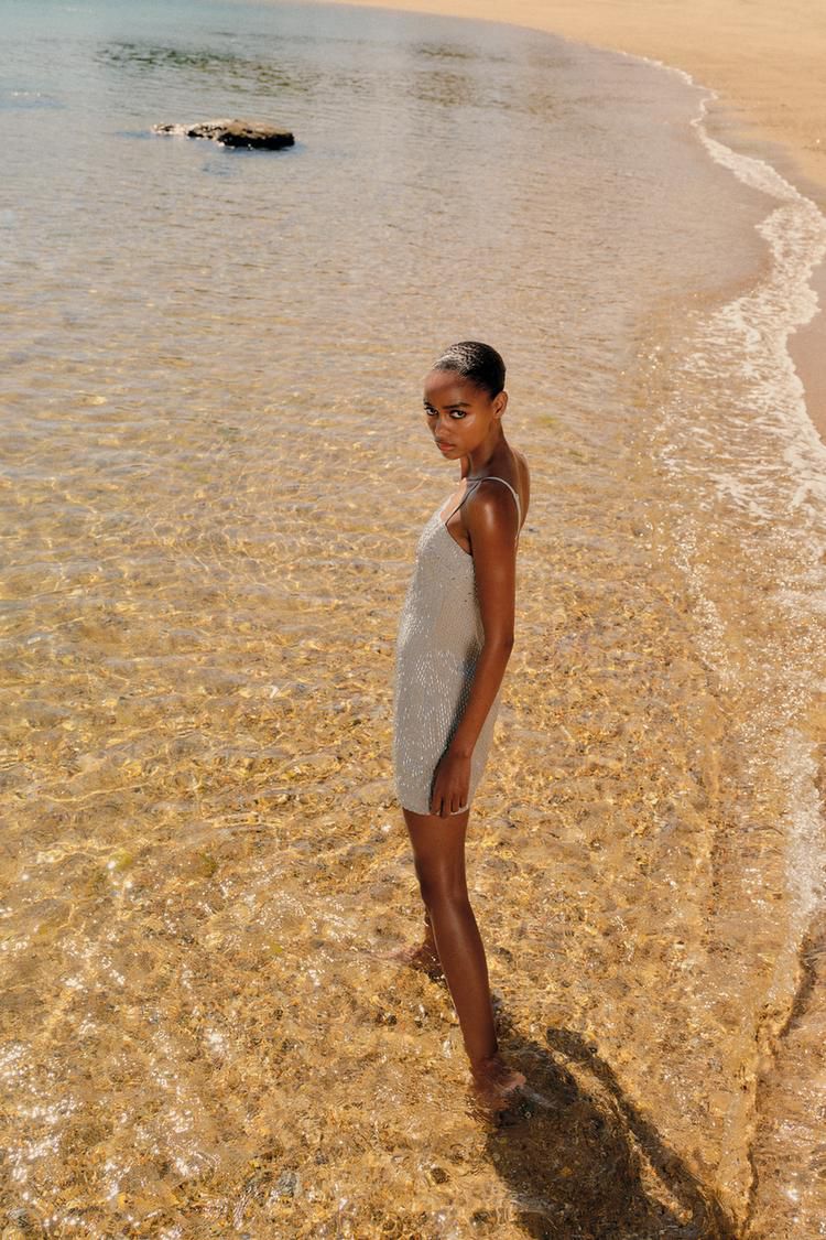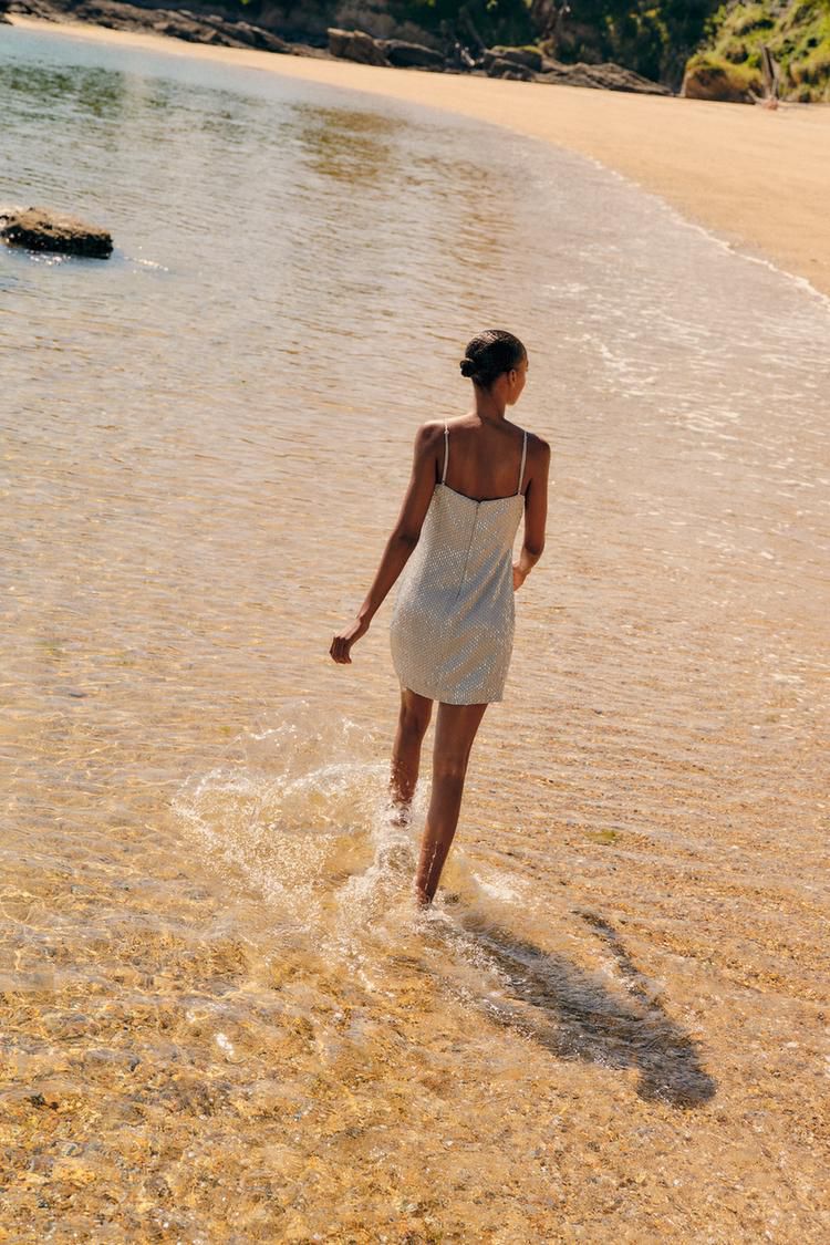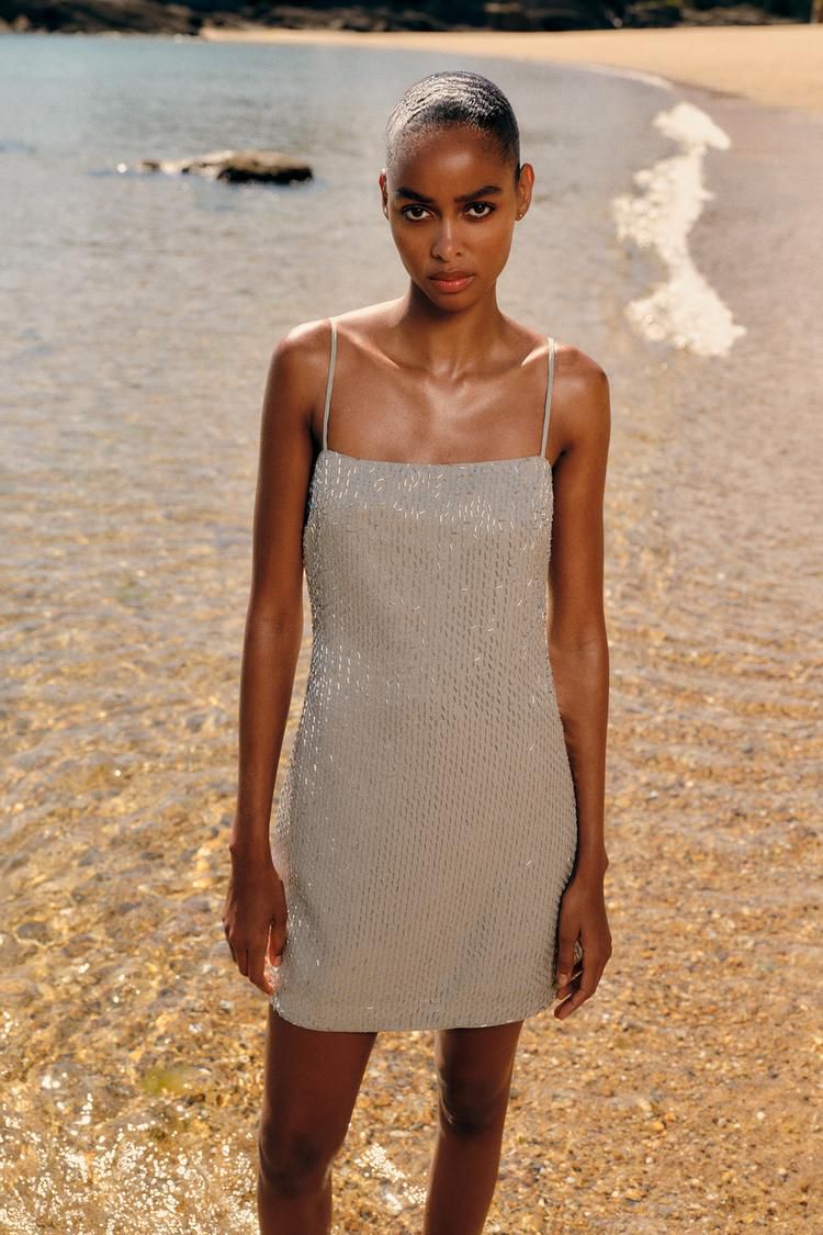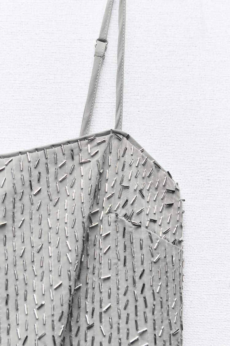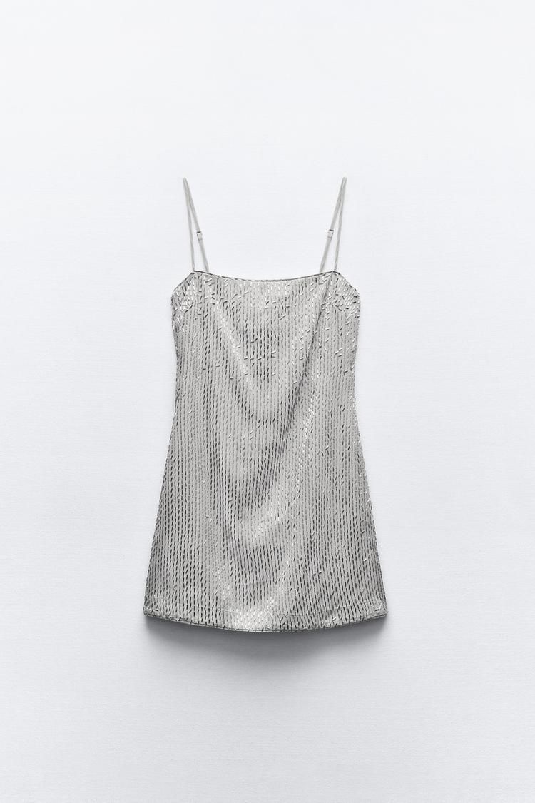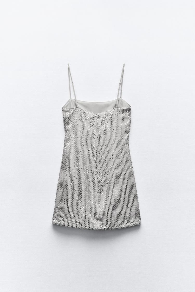 Vestido corto de mujer con escote recto y tirantes finos ajustables. Aplique de canutillos, forro a juego y cierre trasero invisible.